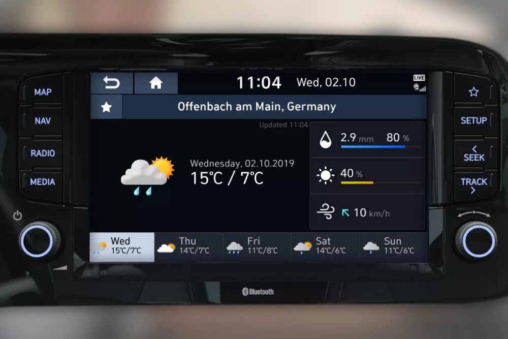 Vuoi sapere che tempo farà? Con i servizi LIVE di Hyundai, puoi monitorare costantemente il meteo previsto nella tua posizione attuale, nella tua destinazione e nelle tue città preferite.