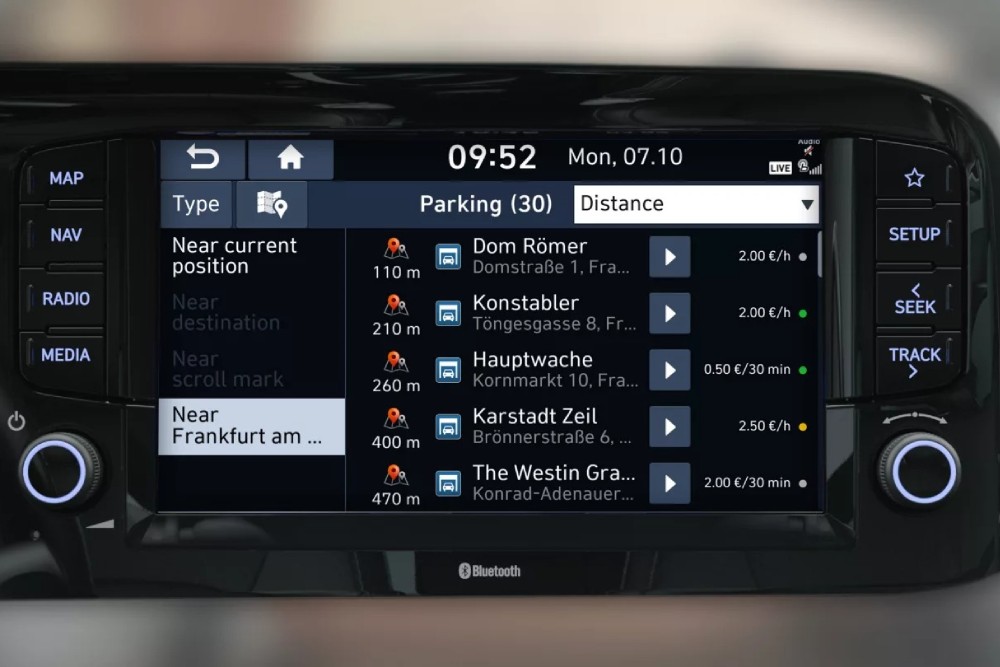 Trova parcheggio più velocemente e senza stress: i Servizi Hyundai LIVE ti consentono di trovare i diversi parcheggi.