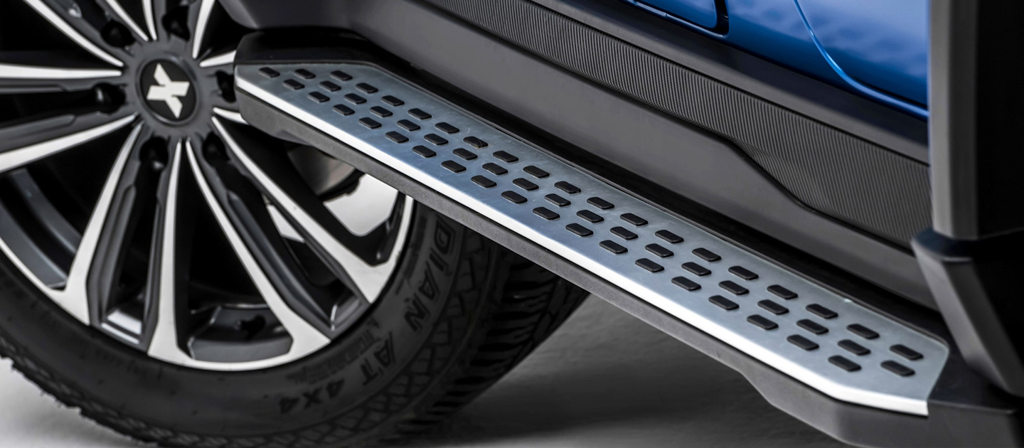 Pedane laterali sottoporta realizzate in materiale plastico e acciaio con inserti in gomma antiscivolo. Per un facile accesso al veicolo in totale sicurezza, anche in caso di condizioni climatiche sfavorevoli. Robuste e stabili, proteggono le fiancate in caso di detriti da percorrenza.